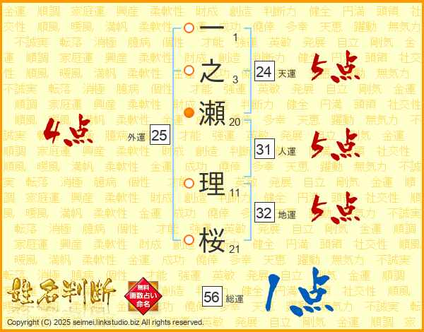 一之瀬理桜さんの人運は31画の5点!