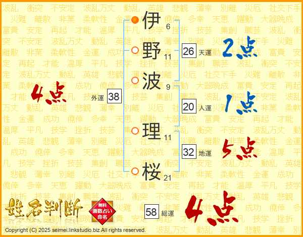 伊(6画)野(11画)波(9画) 理(11画)桜(21画)