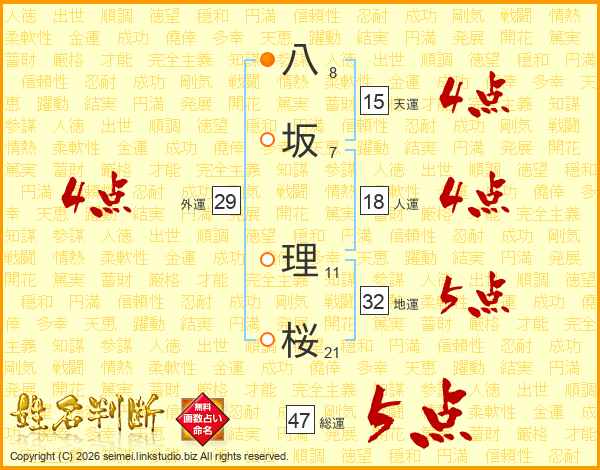 あなたの人生を表す1番重要な運勢です。生涯を通じて影響する総合運となり、主に50歳以降の晩年期に影響を及ぼします。苗字と名前の合計画数。