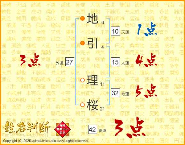 生活面を象徴する運勢です。外部から受ける影響力を表し、結婚運、家庭運や職場、環境への順応性を表します。総運から人運を引いた画数。姓や名が1文字の場合を除く。