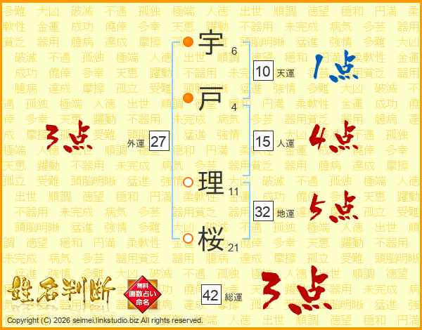 宇(6画)戸(4画) 理(11画)桜(21画)