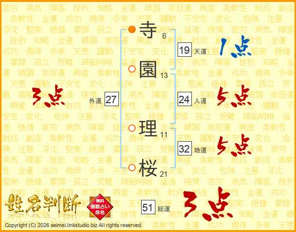 生活面を象徴する運勢です。外部から受ける影響力を表し、結婚運、家庭運や職場、環境への順応性を表します。総運から人運を引いた画数。姓や名が1文字の場合を除く。
