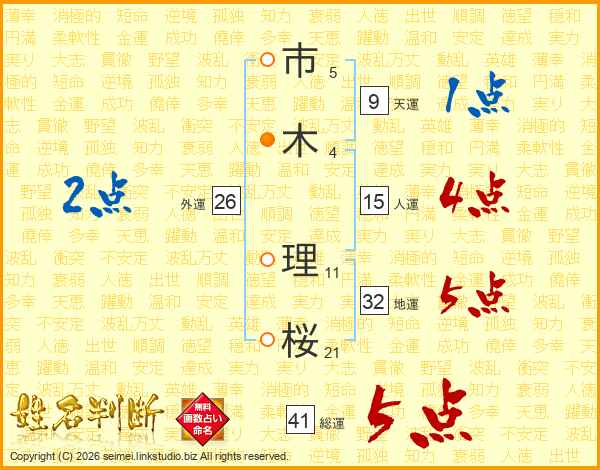 市(5画)木(4画) 理(11画)桜(21画)