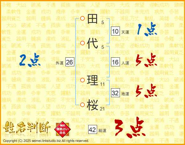 生活面を象徴する運勢です。外部から受ける影響力を表し、結婚運、家庭運や職場、環境への順応性を表します。総運から人運を引いた画数。姓や名が1文字の場合を除く。