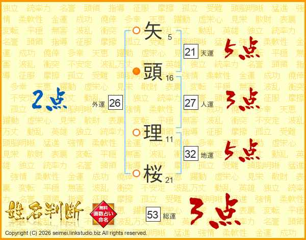 矢(5画)頭(16画) 理(11画)桜(21画)