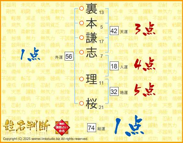 裏(13画)本(5画)謙(17画)志(7画) 理(11画)桜(21画)