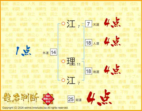 生活面を象徴する運勢です。外部から受ける影響力を表し、結婚運、家庭運や職場、環境への順応性を表します。総運から人運を引いた画数。姓や名が1文字の場合を除く。