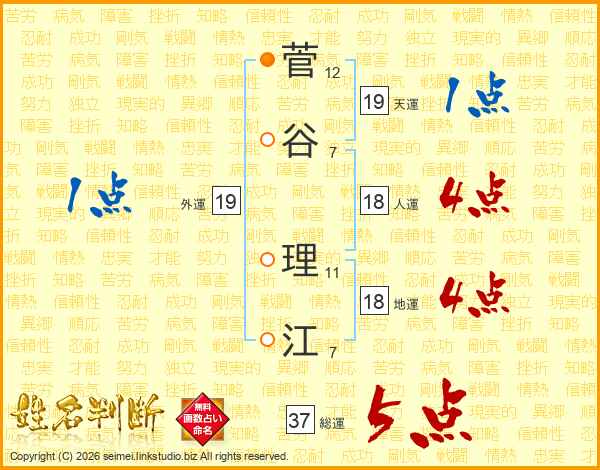あなたの人生を表す1番重要な運勢です。生涯を通じて影響する総合運となり、主に50歳以降の晩年期に影響を及ぼします。苗字と名前の合計画数。