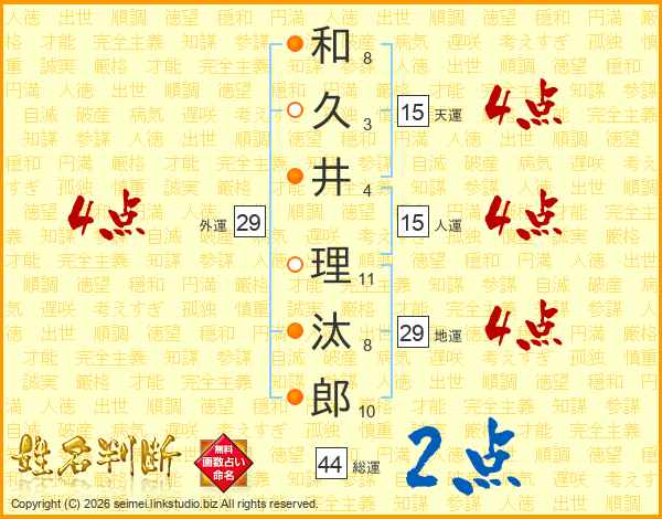 和(8画)久(3画)井(4画) 理(11画)汰(8画)郎(10画)