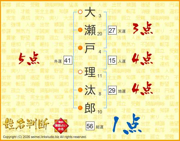 大(3画)瀬(20画)戸(4画) 理(11画)汰(8画)郎(10画)