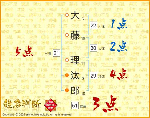 大(3画)藤(19画) 理(11画)汰(8画)郎(10画)