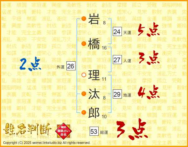 岩(8画)橋(16画) 理(11画)汰(8画)郎(10画)