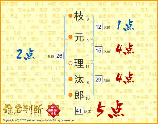 枝(8画)元(4画) 理(11画)汰(8画)郎(10画)