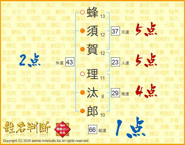蜂(13画)須(12画)賀(12画) 理(11画)汰(8画)郎(10画)