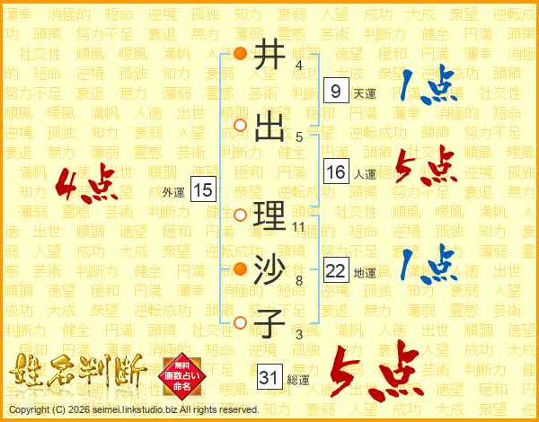 井(4画)出(5画) 理(11画)沙(8画)子(3画)