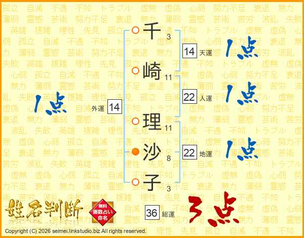 千(3画)崎(11画) 理(11画)沙(8画)子(3画)