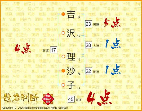 吉(6画)沢(17画) 理(11画)沙(8画)子(3画)