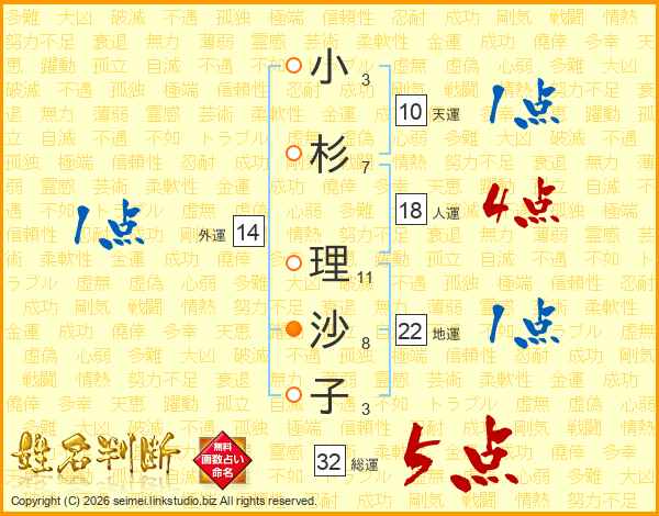 小(3画)杉(7画) 理(11画)沙(8画)子(3画)