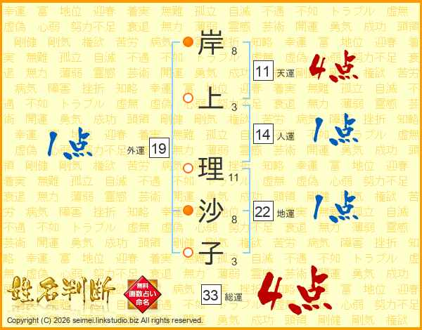 生活面を象徴する運勢です。外部から受ける影響力を表し、結婚運、家庭運や職場、環境への順応性を表します。総運から人運を引いた画数。姓や名が1文字の場合を除く。