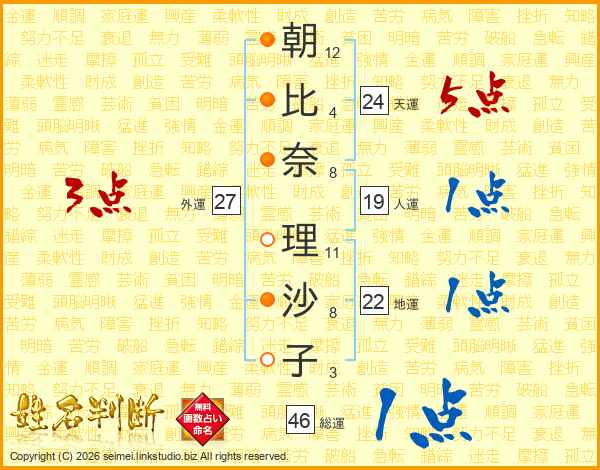 朝(12画)比(4画)奈(8画) 理(11画)沙(8画)子(3画)