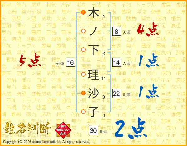 木ノ下理沙子さんの総運は30画の2点!