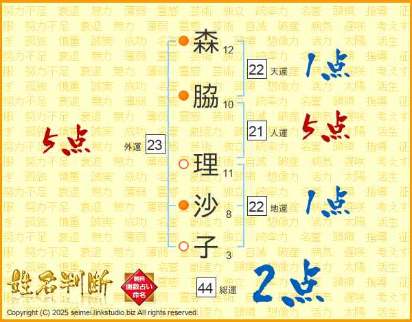 森(12画)脇(10画) 理(11画)沙(8画)子(3画)