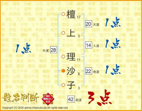 檀(17画)上(3画) 理(11画)沙(8画)子(3画)
