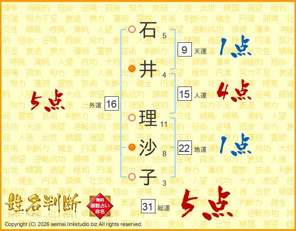 石(5画)井(4画) 理(11画)沙(8画)子(3画)