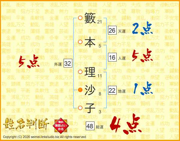 籔(21画)本(5画) 理(11画)沙(8画)子(3画)