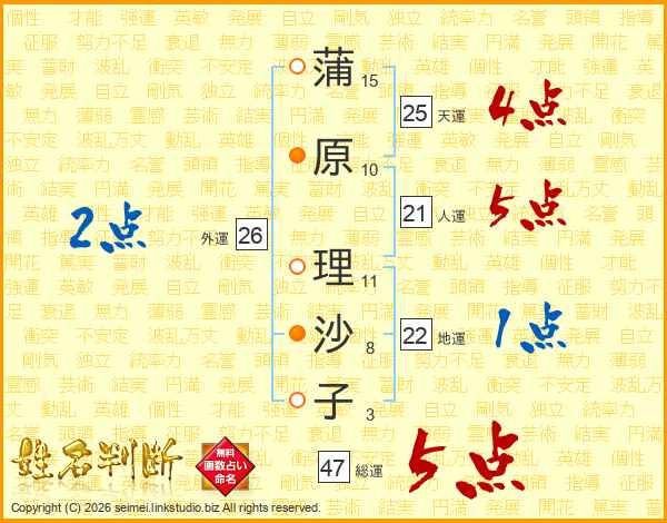 蒲(15画)原(10画) 理(11画)沙(8画)子(3画)