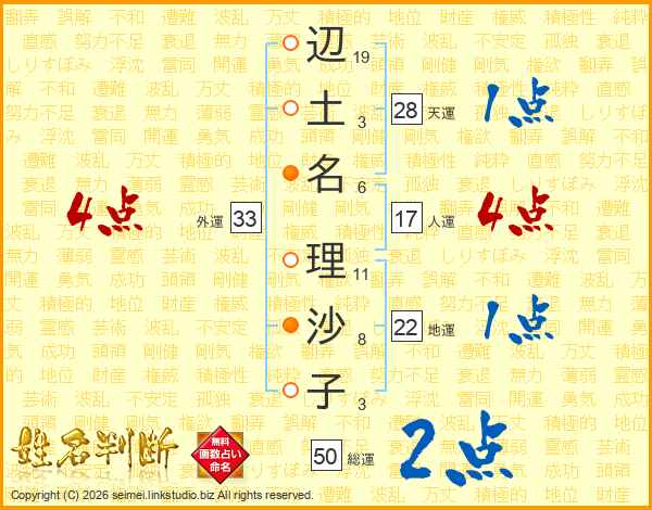 辺(19画)土(3画)名(6画) 理(11画)沙(8画)子(3画)