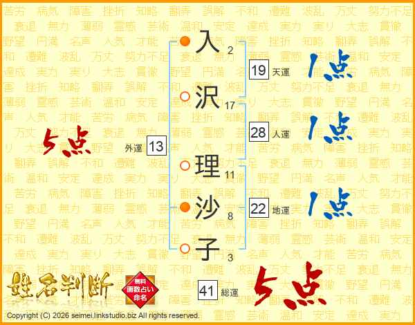 入(2画)沢(17画) 理(11画)沙(8画)子(3画)