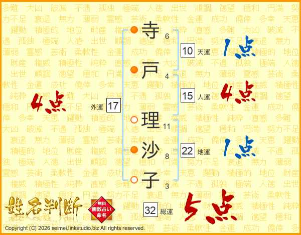 寺(6画)戸(4画) 理(11画)沙(8画)子(3画)