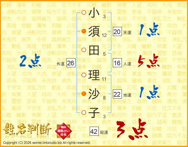 小(3画)須(12画)田(5画) 理(11画)沙(8画)子(3画)