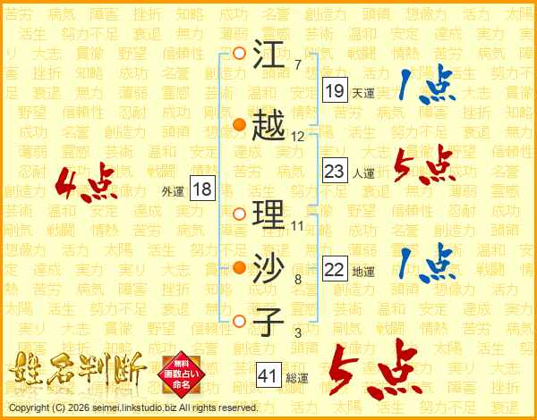 江(7画)越(12画) 理(11画)沙(8画)子(3画)