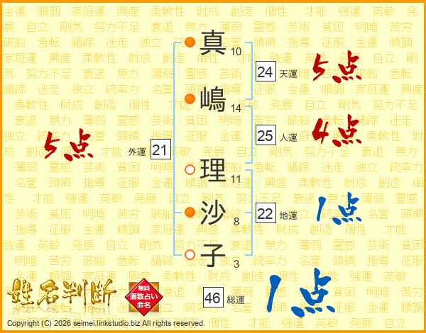 真嶋理沙子さんの総運は46画の1点!