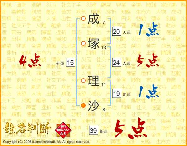 生活面を象徴する運勢です。外部から受ける影響力を表し、結婚運、家庭運や職場、環境への順応性を表します。総運から人運を引いた画数。姓や名が1文字の場合を除く。