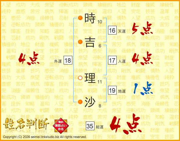 生活面を象徴する運勢です。外部から受ける影響力を表し、結婚運、家庭運や職場、環境への順応性を表します。総運から人運を引いた画数。姓や名が1文字の場合を除く。
