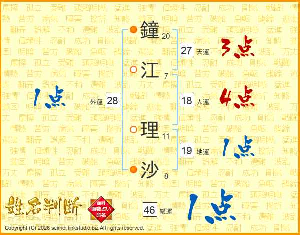 鐘(20画)江(7画) 理(11画)沙(8画)
