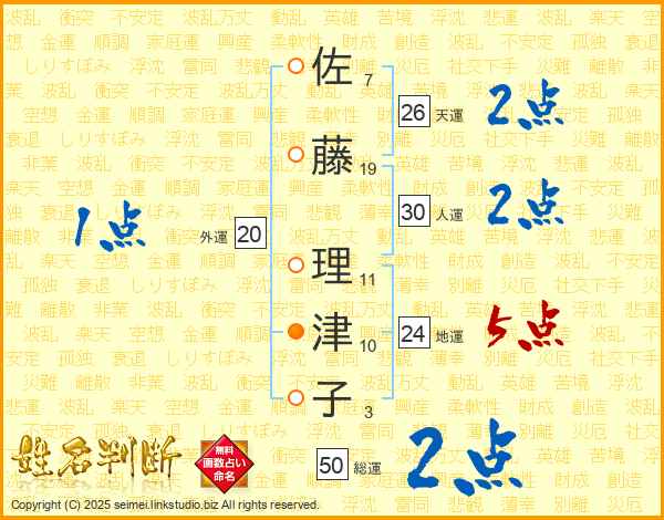 佐(7画)藤(19画) 理(11画)津(10画)子(3画)