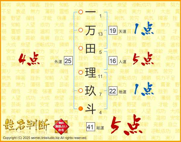 生活面を象徴する運勢です。外部から受ける影響力を表し、結婚運、家庭運や職場、環境への順応性を表します。総運から人運を引いた画数。姓や名が1文字の場合を除く。
