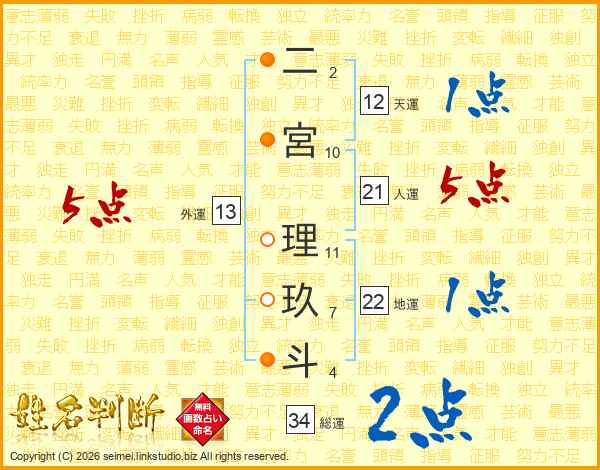生活面を象徴する運勢です。外部から受ける影響力を表し、結婚運、家庭運や職場、環境への順応性を表します。総運から人運を引いた画数。姓や名が1文字の場合を除く。