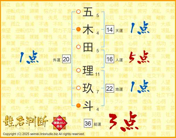 五(5画)木(4画)田(5画) 理(11画)玖(7画)斗(4画)