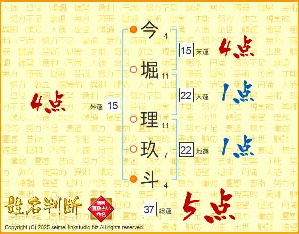 今(4画)堀(11画) 理(11画)玖(7画)斗(4画)