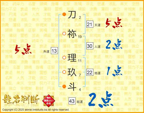 刀(2画)祢(19画) 理(11画)玖(7画)斗(4画)