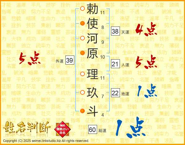 勅(11画)使(8画)河(9画)原(10画) 理(11画)玖(7画)斗(4画)