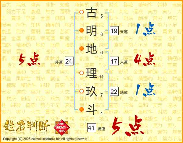 古明地理玖斗さんの外運は24画の5点!