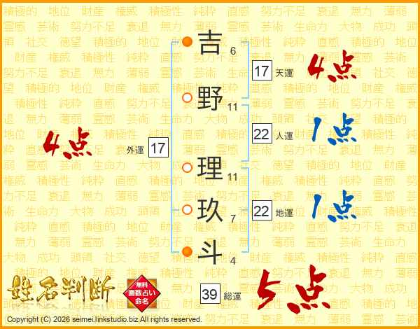 吉(6画)野(11画) 理(11画)玖(7画)斗(4画)