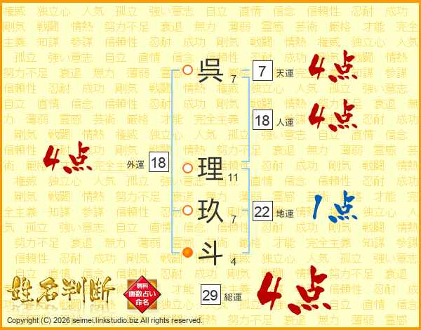 呉(7画) 理(11画)玖(7画)斗(4画)
