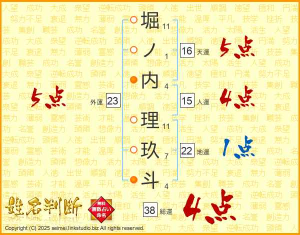 堀(11画)ノ(1画)内(4画) 理(11画)玖(7画)斗(4画)